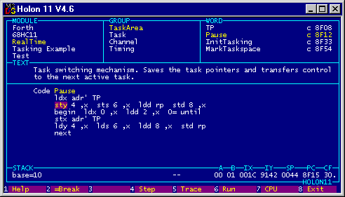 The word Pause is the task switcher, which passes control to the next task. Tasks pass control deliberately. In practice this simple scheduling is highly effective.