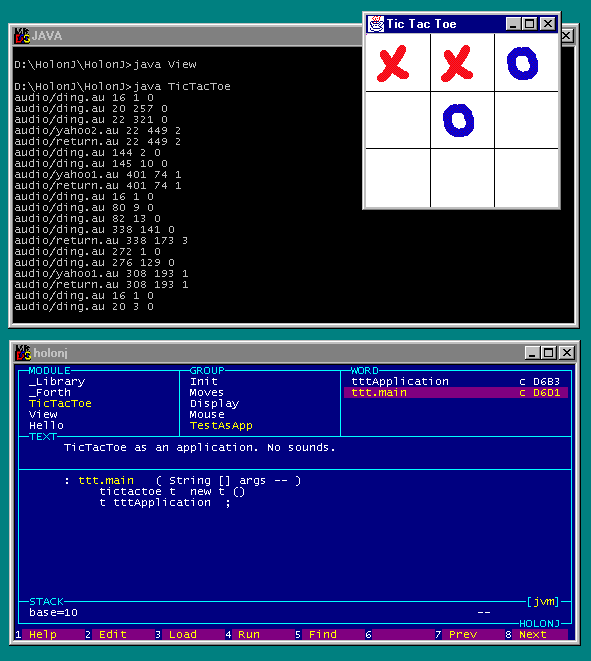 Here are two DOS sessions, one each for HolonJ and for the Java interpreter's console window.