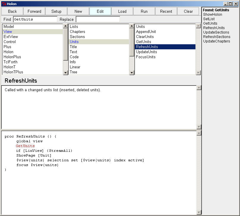 The Find and Replace entry fields are continuously present. The info pane at the right shows the results of searches, the items link to their respective pages. Shortcut: Click with the right mouse button on a word to search.