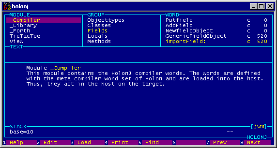 HolonJ runs under DOS. When HOLONJ.EXE starts, it looks for the files HOLONJ.STR and HOLONJ.TEX in the working directory. For details see the file WELCOME.HTM in the HolonJ distribution.